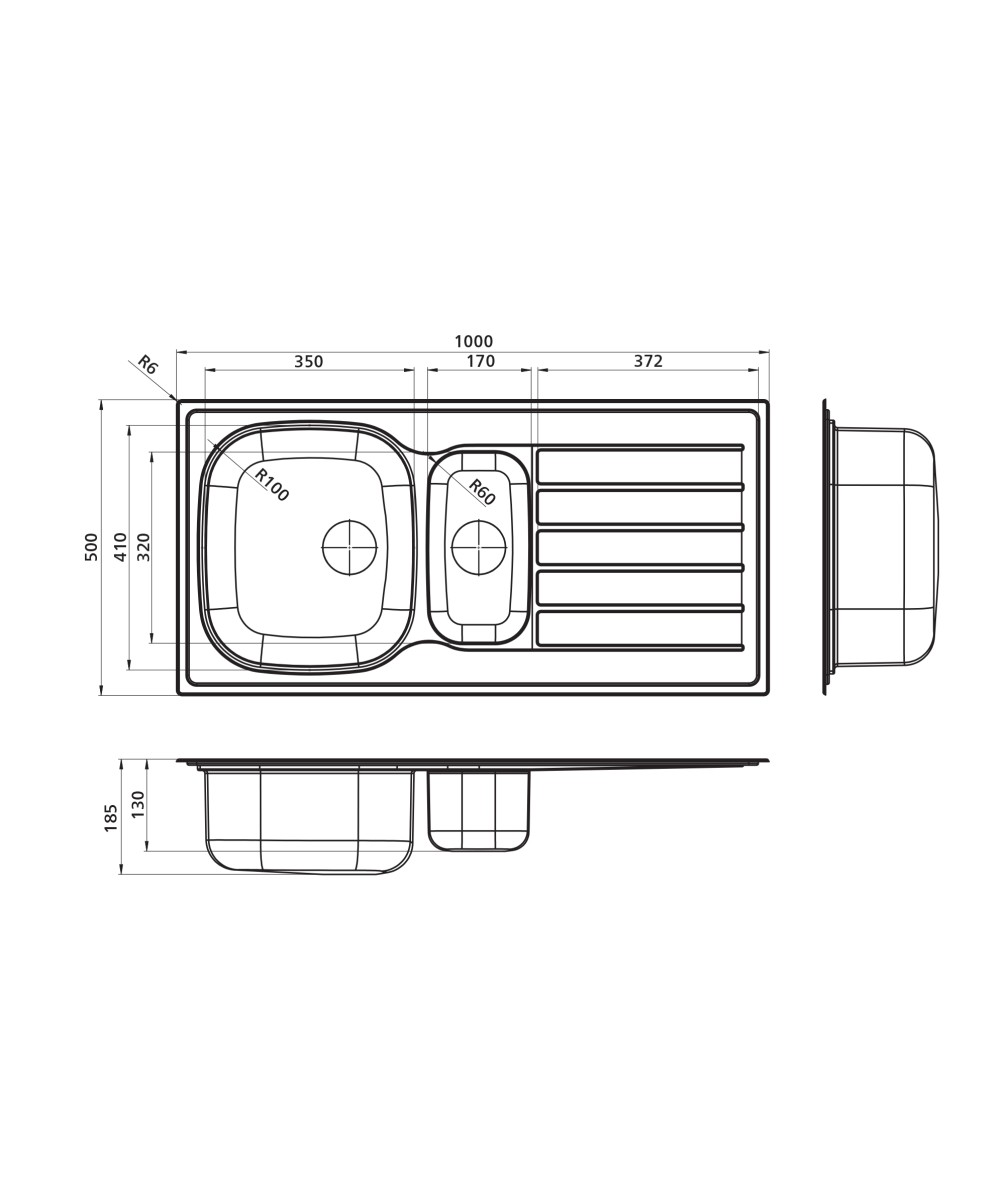 Acero 1000 Stainless steel sink. 1 1/2 bowl and 1 drainer. Includes basket wastes.