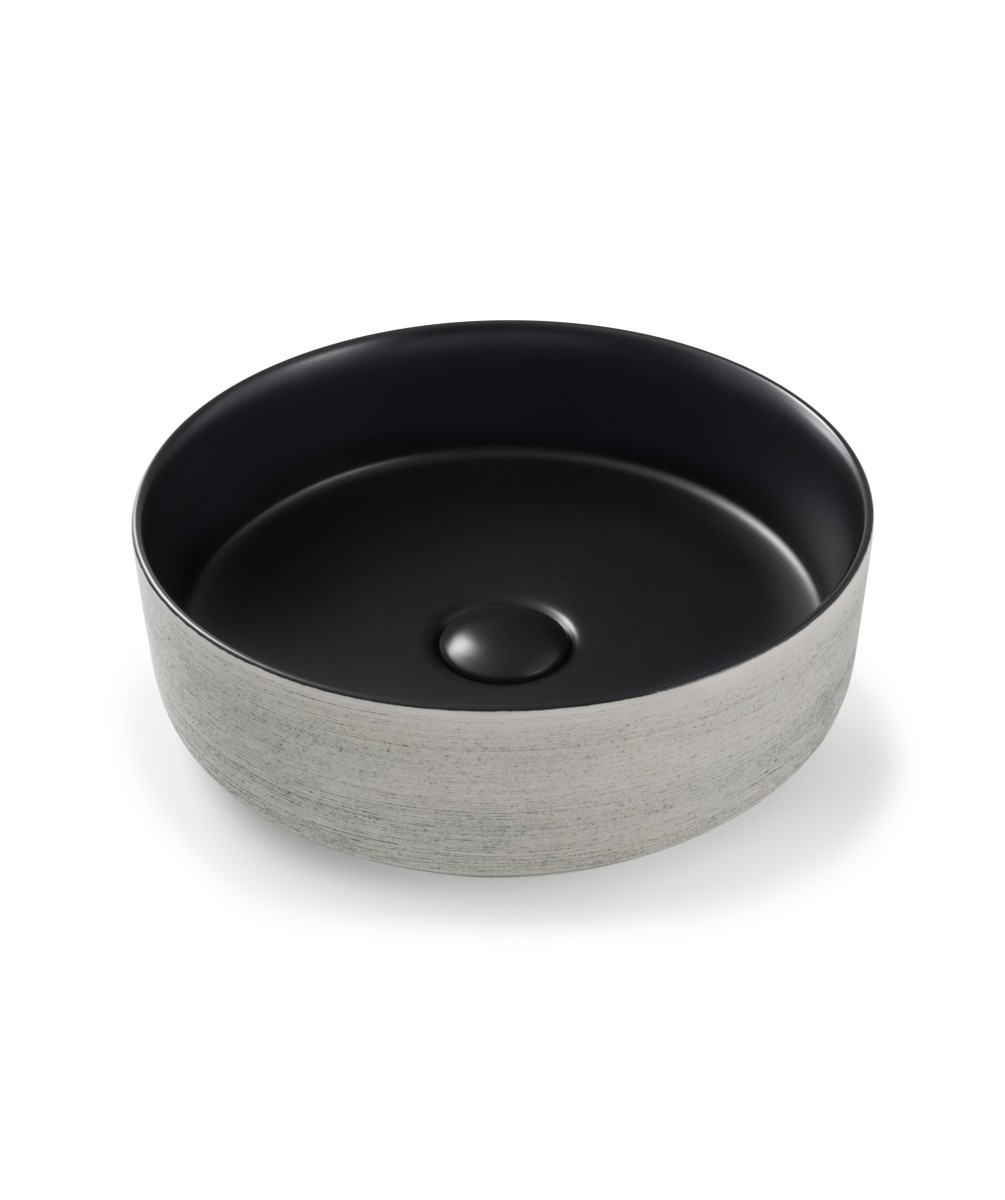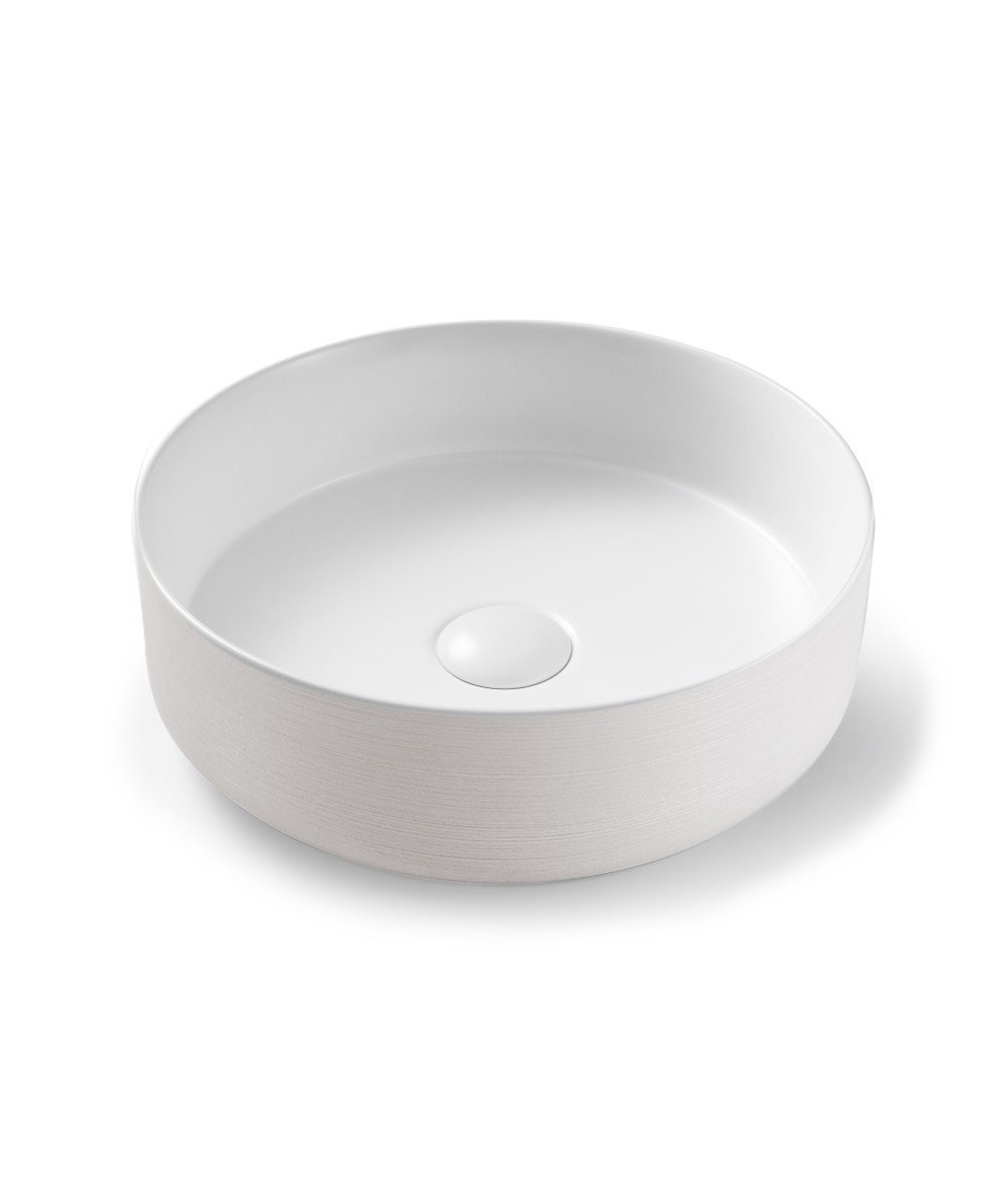 ARKO 365 Ceramic Basin. Above counter. Round. 355Dx115Hmm. Internal: White Gloss. External: White Texture.32mm Waste – not included.ARKO 355 Basin. Available in White (textured), Black/Green (Textured), Black/White (Silk) & White (Silk)
