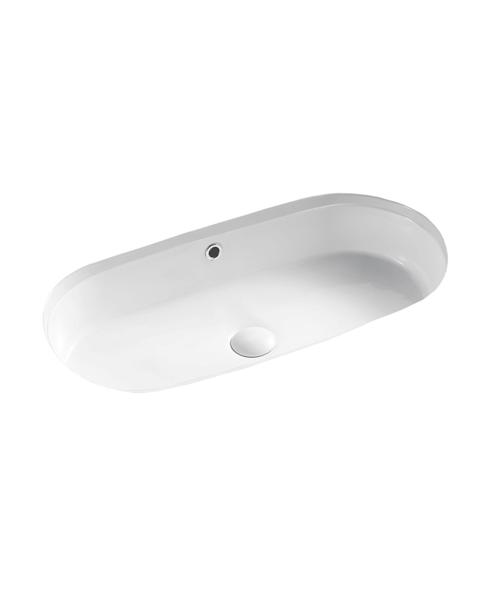 An elegant wide super-ellipse shaped under counter basin with straight sides and central waste. Overflow is normally placed at front of basin, hidden from view.