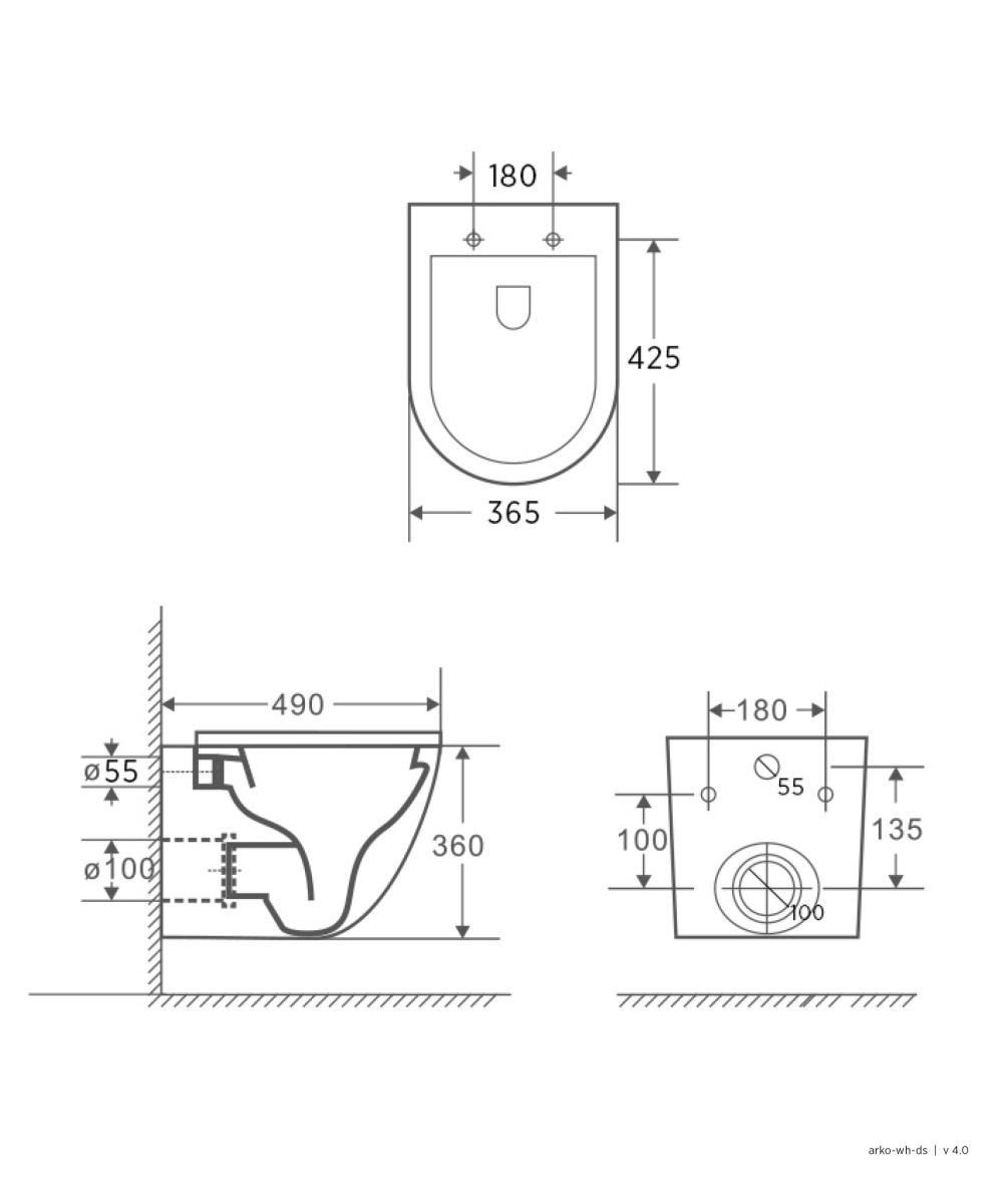 ARKO WH Clean Flush Wall Hung toilet pan, includes Seima InWall C201 thin cistern, Flat soft closing seat with s/steel hinges. WELS 4 star 4.5/3L flush (Excludes flush buttons).