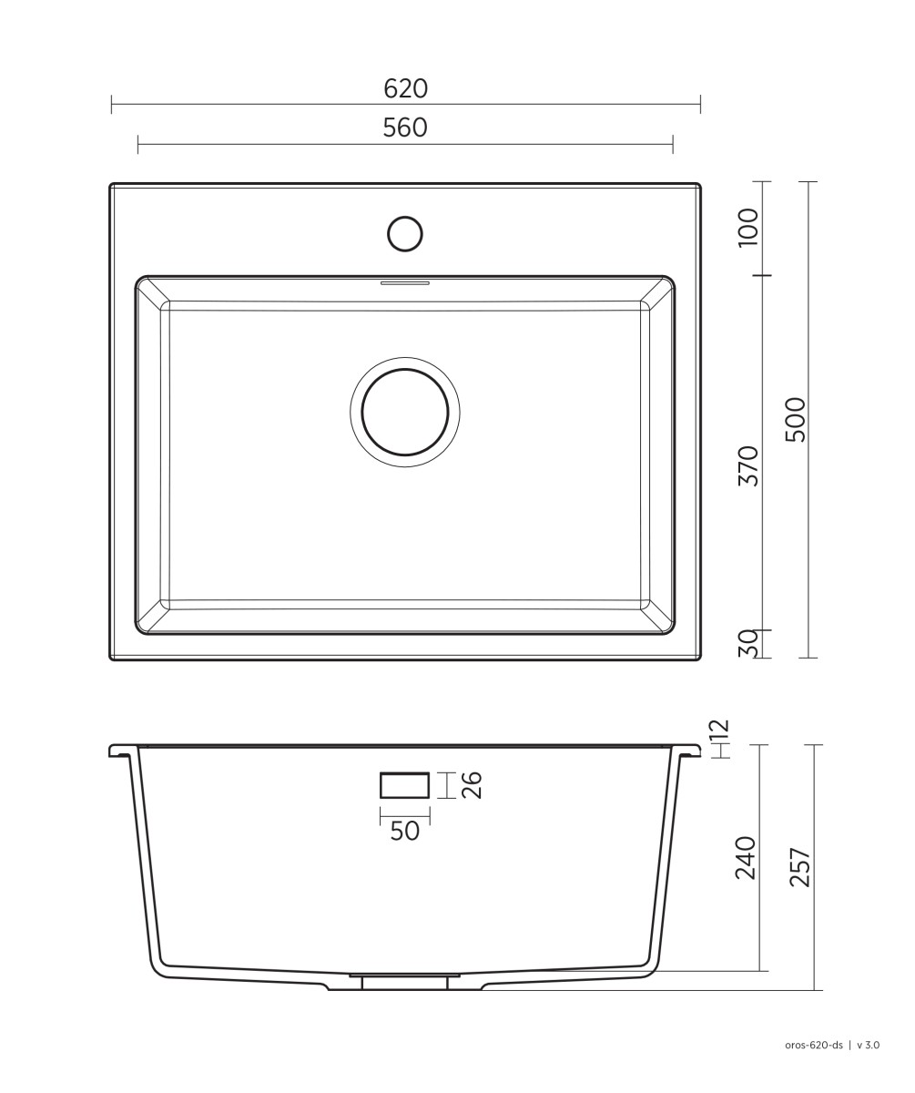 Oros 620 Arqstone sink 1 bowl. Integrated overflow. 620 x 500 x 240mm. 90mm stainless steel basket waste included. Available with no taphole, 1 taphole or 3 taphole. Available in black or white.