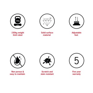 Solid surface is an engineered material composed from acrylic resins and pigments. The advantage of this is a solid colour throughout and free from silica. Solid surface offers a durable product that is stain-resistant, antimicrobial and is easy to maintain.