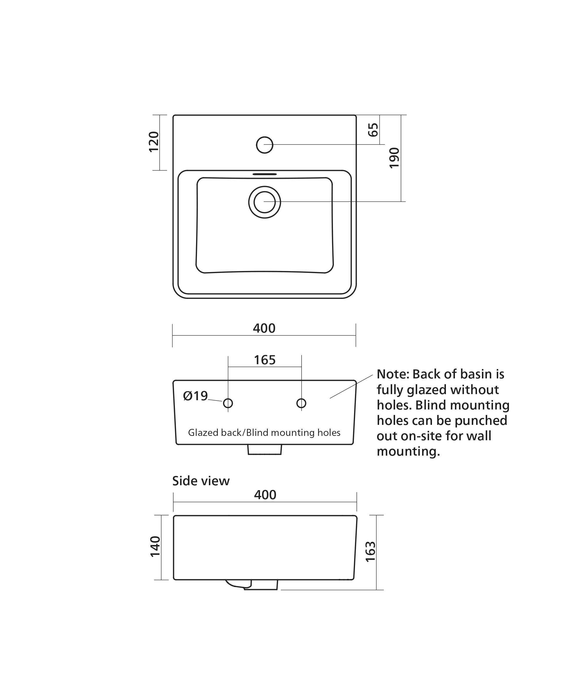 Back of basin is fully glazed without holes. There are blind fixing holes on the back. If wall mounting, the blind fixing holes can be punched out on site at installation.