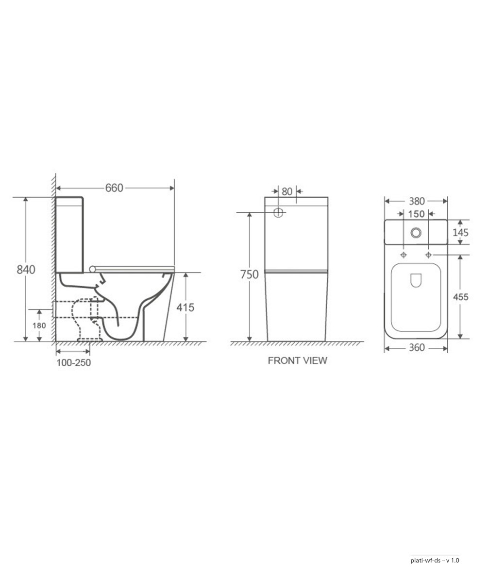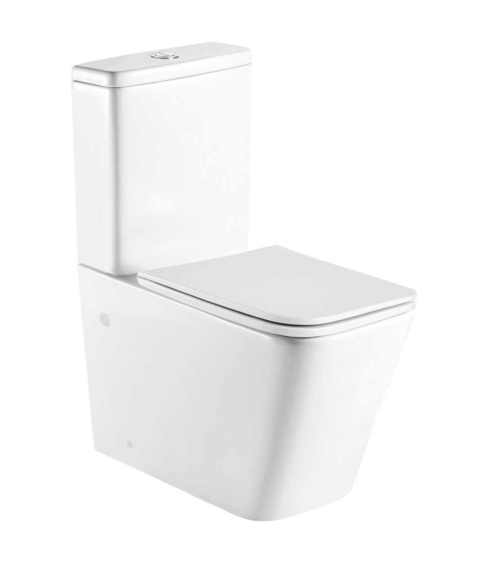 Square Wall Faced Toilet Cistern + Pan + Seat. Ceramic. Clean Flush. Seat (Soft-closing, quick release with s/steel hinges) – Included. WELS