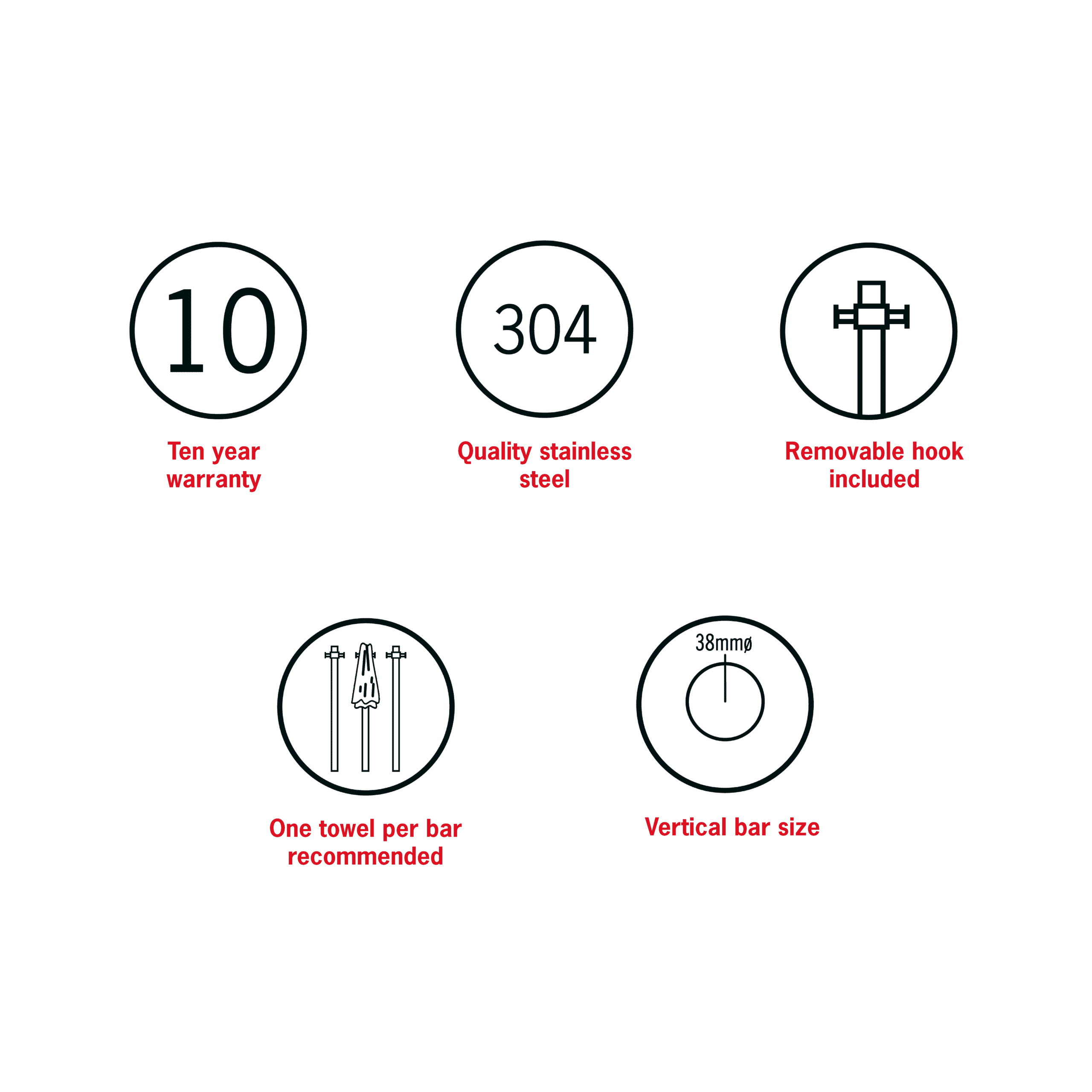 All Thermorail vertical heated towel rails include an optional towel hook which can be fitted on the rail at the time of installation. This hook allows for the towel to be more easily hung over the vertical rail or for hanging smaller hand towels or washers.