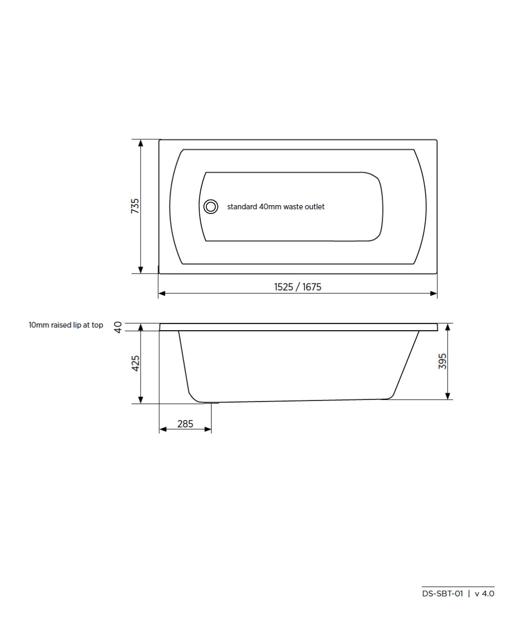 SYROS 103, bath — inset — 1525 long White sanitary grade acrylic, high gloss finish, classic bath with smooth, clean lines, 1525Lx735Wx425Dmm, capacity 230 litres, fits 40mm waste, no overflow