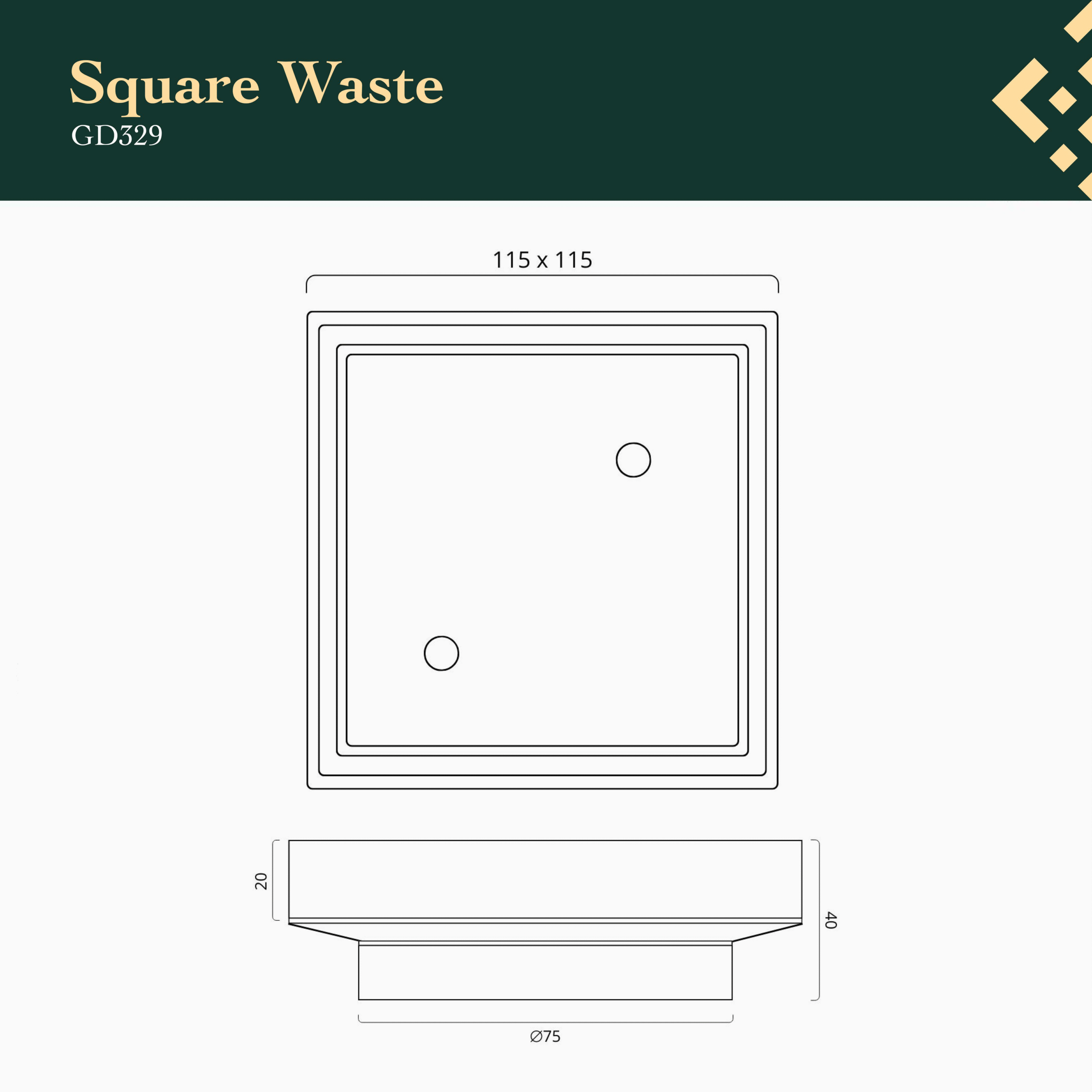 Tile insert floor waste, 115 x 115 x 20mm with 75mm diam outlet. Available in Chrome plated, matte black, satin nickel, Gun metal, Antique Brass, Brushed Gold.