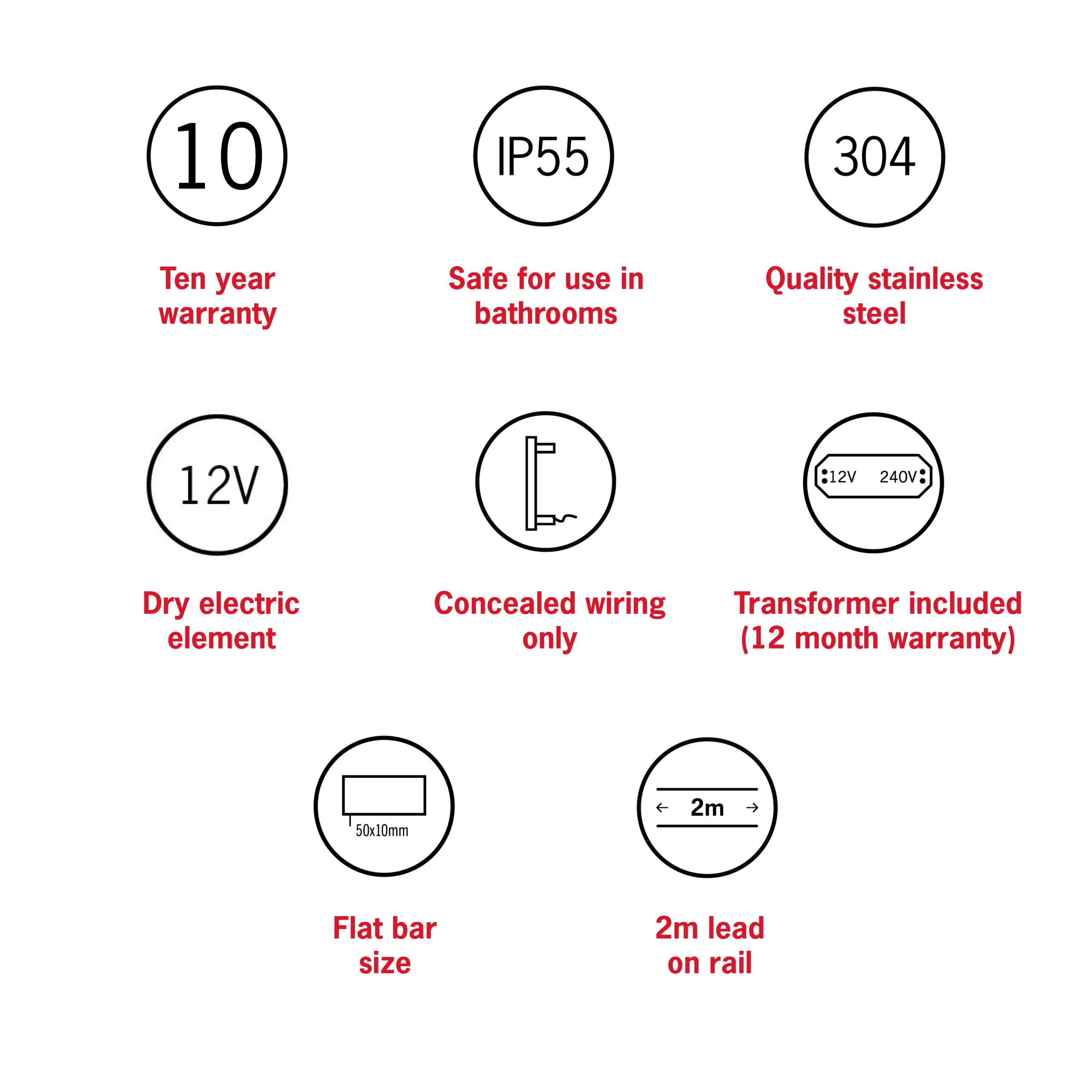 The Thermorail single bar heated towel rails are all 12Volt which means they are safe to be installed anywhere in the bathroom, even close to water. All the 12Volt single bar rails are provided with a transformer in the box. We also recommend the use of a timer to control the rails and save on running costs.