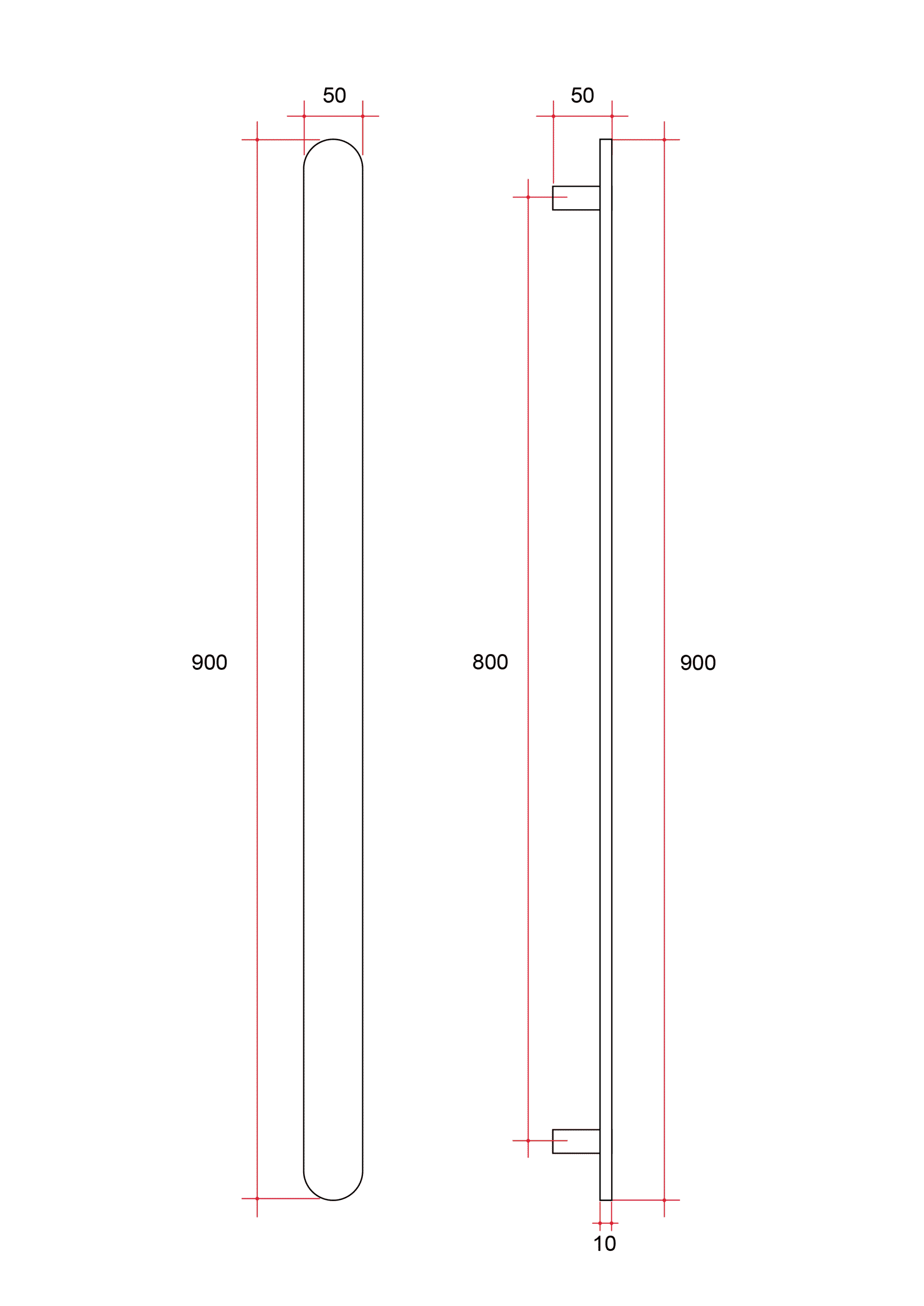50 x 900 x 50mm, pill shaped profile.